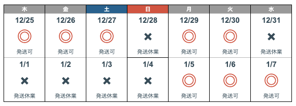 ※休暇期間中も配送日時指定はしていただけますが、物流増加の遅延などによりお約束ができかねる旨、予めご了承ください。